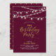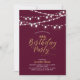 ¡Celebra un día especial con esta invitación a la fiesta de cumpleaños de oro de la moda! Este diseño presenta luces de cuerda y una tipografía elegante de escritura dorada con un fondo rojo borgoña. Puede personalizar el texto a cualquier cumpleaños de edad/hito. En mi tienda BaraBomDesign hay más invitaciones para adultos y suministros para fiestas.