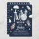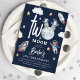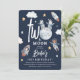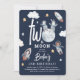 Super lindo Espacio de animales de Woodland con tema de 2da invitación de cumpleaños. El diseño presenta el título "DOS la luna", que incorpora una luna, decorada con adorables animales de bosque como astronautas, cohetes, estrellas y nubes. La plantilla de moda es una combinación de escritura a mano elegante y tipografías serif blancas. Todo el texto es fácil de personalizar con la plantilla proporcionada.