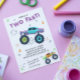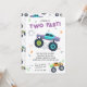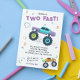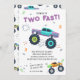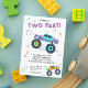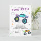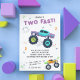 Dos camiones de coches de bebé monstruo de cumpleaños Fast 2nd Invitation incluye camiones de coches monstruo adorables y coloridos con el texto "Dos rápido" en el guión moderno de tipografía púrpura acentuado con el número 2 y garabatos. Perfecto para las celebraciones de la fiesta de segundo cumpleaños de los niños. Envíe el correo o simplemente descargue la invitación digital que se puede descargar. Diseñado por Evco Studio. Para coordinar elementos, vea www.zazzle.com/store/evcostudio