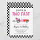 Carta de invitación a la fiesta de cumpleaños número 2 de un niño con tema de carrera especial, con ilustracion de un coche de época rosa con llamas. El texto dice "creciendo dos rápido.