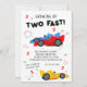 Dos vehículos de Carreras Fast 2nd Birthday Kids Invitation incluye coches de carreras adorables y coloridos con el texto "Dos rápido" en el guión moderno de tipografía negra acentuado con el número 2 y garabatos. Perfecto para las celebraciones de la fiesta de segundo cumpleaños de los niños. Envíe el correo o simplemente descargue la invitación digital que se puede descargar. Diseñado por Evco Studio. Para coordinar elementos, vea www.zazzle.com/store/evcostudio
