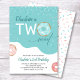 Esta encantadora invitación verde azulada para la fiesta de cumpleaños está diseñada para un chica que cumple 2 años. El texto moderno dice "El nombre es DOS dulce" acentuado con una espoleta escarpada.