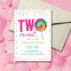 Estas encantadoras invitaciones para fiestas de cumpleaños incluyen un colorido dulce de color lollipop dulce con el borde decorativo de rociadores. Personalice las invitaciones de la fiesta de cumpleaños agregando el nombre, la edad y los detalles del fiesta de su hijo.