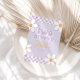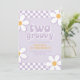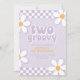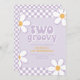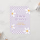 Invitación de cumpleaños número 2 inspirada en la moda retro con fuentes al estilo de los 70, margaritas y patrón de cuadros.