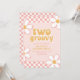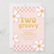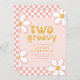 Invitación de cumpleaños número 2 inspirada en Two Groovy Retro con fuentes al estilo de los 70 y margaritas y patrón de cuadros.