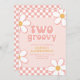 Invitación de cumpleaños número 2 inspirada en Two Groovy Retro con fuentes al estilo de los 70 y margaritas y patrón de cuadros.