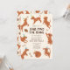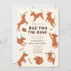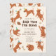 Cuta tarjeta de invitación para la fiesta de cumpleaños con ilustracion a mano de cachorros jugando con gorras fiestas. Trabaja para la fiesta de cumpleaños de chica o niño. El texto dice "dos mal el hueso".