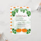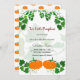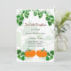 Invitación a baby shower con tema de calabazas de Halloween con diseño de dos calabazas pintadas con acuarela en naranja y verde cálido.