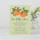 Esta adorable ducha de bebé gemela tiene un diseño de naranjas pintados a mano con flores sobre un fondo de color personalizado (se muestra en verde limón claro). La tipografía elegante dice: "Dos pequeñas ciudades" están en camino. La parte posterior contiene un patrón de flores naranjas simple y concordante. ¡Genial para la mamá esperando a un chico/chica gemelos! Obra de arte/Ilustracion de Tracey Khalei / Orabella Prints.