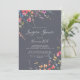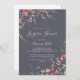 Esta clásica invitación azul a la ducha de lencería salvaje es perfecta para una ducha rústica de boda. El diseño se compone de flores silvestres amarillas, violetas y blancas con follaje en un fondo de color rosa y verde.