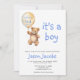 Celebra con estilo esta adorable invitación a una ducha de bebé con un lindo oso de peluche flotando con un globo dorado. El lúgubre texto azul anuncia "es un niño", mientras que el globo ofrece espacio para resaltar la fecha y hora de tu ducha. Este alegre diseño combina un encanto caprichoso con detalles prácticos, como invitados de honor, lugar de celebración, RSVP, e información del registro, lo que lo hace perfecto para duchas de bebé alegres o fiestas reveladores de género. Los tonos cálidos de las acuarelas y el ilustracion de oso dulce dan un toque de alegría a la pequeña.