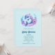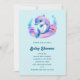 Invitación de ducha de bebé con una ilustración adorable. Un delfín azul y púrpura rodeado de hermosas flores submarinas.