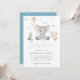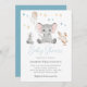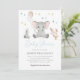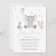 Invitación de ducha de bebé de elefante linda con un elefante dibujado a mano, ganso y foca rodeados de destellos azules y dorados, ideal para una ducha de bebé neutral en cuanto al género.