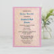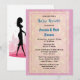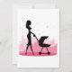 Una invitación de ducha de bebé azul turquesa. El fondo es un patrón desvanecido de pequeñas huellas de bebé rosadas. La parte trasera tiene una mamá de moda empujando su cochecito de bebé mientras se aventura en la ciudad. Personalice con todos los detalles de su fiesta.
