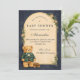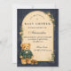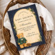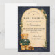 Un encantador diseño de baby shower preppy que presenta un oso de peluche dulce vestido con una chaqueta clásica de cuadros verdes y corbatín. Sobre el oso, una delicada cuerda para tender la ropa muestra ropa y zapatos diminutos para bebé, creando una escena nostálgica de guardería de cuento de hadas. El fondo azul marino profundo y el borde sutil de tartán añaden un toque refinado y de inspiración vintage que se siente elegante y juguetón. Perfecto para una celebración de baby shower con estética preppy clásica y elegante.