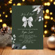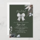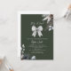 Tema de ducha de bebé niña con botánicos invernales en la parte superior derecha e inferior izquierda. La parte superior presenta una ilustración de un lazo blanco. El fondo es verde oscuro.