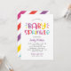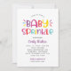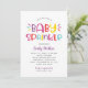 Esta divertida y colorida invitación para baby sprinkle presenta letras en negrita de "Baby Sprinkle" en una paleta de arcoíris juguetona de rosa intenso, violeta púrpura, azul aqua, rojo naranja y amarillo brillante sobre un fondo blanco crujiente. Las rayas diagonales de cabana en arcoíris añaden un toque festivo y llamativo en la parte trasera. Todo el texto es totalmente personalizable para tu celebración de sprinkle. Una elección perfecta para una fiesta de sprinkle de una niña vibrante y moderna.
