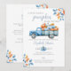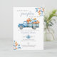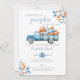 Esta elegante invitación para baby shower presenta un otoño rústico, hojas de otoño y un camión azul lindo lleno de calabazas. Con el código QR de tu registro y los detalles del evento en el reverso. Diseñado por Thisisnotme©