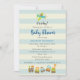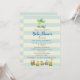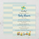 Invitación para ducha de bebé niño. Diseñada con una ilustración de arte de guardería infantil con un perrito montado en un avión y un tren de juguete lleno de animales caprichosos. Puesta en un fondo a rayas crema y azul.