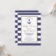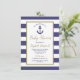 Esta invitación para baby shower náutico presenta un ancla azul marino en un rectángulo con borde dorado falso sobre un fondo de rayas azules marino y blancas. Dentro del rectángulo, las palabras "Baby Shower", el nombre de la futura madre y la fecha límite de RSVP aparecen en escritura dorada a mano. El texto restante está en azul marino. Ideal para un baby shower de niño. El texto es completamente personalizable. ¿Necesita artículos que coincidan con su baby shower temático náutico? Vea nuestra colección para suministros de fiesta y decoraciones adicionales en este diseño.
