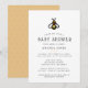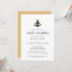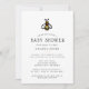 Invitación de ducha de bebé con arte de abeja en línea moderna en negro y naranja con corazón verde en el medio. Tipografía moderna utilizada. En la parte posterior de la tarjeta es amarillo polvoriento con patrón de panal de abeja fantasma.