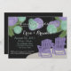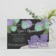 Lámparas de papel violeta y verde sobre las tumbonas de la terraza, invitación a la ducha de la pareja temática de la playa.