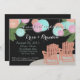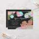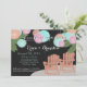 Linternas de papel rosa, acuático y de coral sobre sillas adyacentes, invitación a la ducha de una pareja con temática de playa.