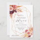 La invitación a la ducha de parejas incluye flores de color acuático rústico en terracota, burdeos, naranja quemado, amarillo, rubor de pasto beige y marrón y un marco geométrico dorado. Para una personalización más avanzada de este diseño, haga clic en el enlace "personalizar más adelante". También están disponibles los elementos coincidentes.