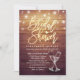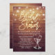Plantillas de tarjetas de invitación para duchas nupciales - Elegante guión de ordeño, Vintage Champagne y String Lights sobre fondo rústico de madera. Todos Los Estilo De Texto, Los Colores Y Los Tamaños Se Pueden Modificar Para Ajustarse A Sus Necesidades.