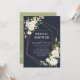 Hermoso y elegante, este moderno rosa de cobre de mármol dorado blanco con ducha de novias floral con motivos florales, se caracteriza por un Relieve metalizado de imitación dorado rosa de cobre geométrico, adornado con hermosas flores de acuarela pintadas a mano y vegetación en tonos blancos y crema, con un fondo azul marino moderno. La parte posterior de la tarjeta presenta una textura de acuarela pintada a mano en verde. Copyright Elegant Invita, todos los derechos reservados.
