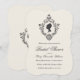 Todo el texto está escrito en caligrafía elegante. El fondo es de color marfil (casi blanco). El texto, el escudo y la silueta de la dama son grises, casi negros.