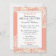 Elegante diseño de encaje blanco sobre fondo de coral color tarjeta de invitación a la ducha novia.
