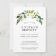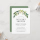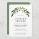 Invitación elegante de ducha de boda de parejas con flores que presenta una guirnalda pintada a mano con acuarela con rosas blancas y vegetación en la parte superior. La parte posterior es de un verde sólido y se puede cambiar a cualquier color que desee. Estas invitaciones son perfectas para una ducha de parejas en verano.