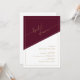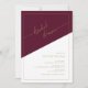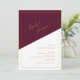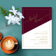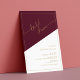 Fijar el tono para una sofisticada celebración con nuestra Invitación a la Ducha Gétrica de Borgoña y Oro. Este elegante diseño presenta un llamativo fondo geométrico en un profundo color burdeos y blanco clásico, creando un estilo moderno y elegante para su evento. La frase "ducha de novia" se presenta con gusto en un brillante guión dorado sobre un fondo burdeos en diagonal audaz, añadiendo un toque de lujo y refinamiento. Personalizar esta invitación de moda con sus datos personales, incluyendo el nombre de la novia, fecha, lugar e información de RSVP. Estos detalles se presentan dentro de una línea de borde de marco dorado, complementada con la coordinación de la tipografía de sans serif y serif de oro sobre un fondo blanco diagonal. La fusión de elementos geométricos contemporáneos con abundantes acentos burdeos y dorados hace de esta invitación una elección para una ducha de novia memorable y elegante.