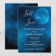 Una carta de invitación romántica para una ducha rústica de novia. Una noche azul oscuro y una noche con luna llena. Con el texto: Caer enamorada. Plantillas para un nombre, fecha, lugar de evento y detalles de RSVP. El nombre está escrito con una escritura de estilo con letras a mano moderna. Letras blancas.
