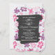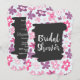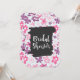 Una invitación de ducha de novia caprichosa con un lindo patrón floral. Compuesta por flores rosas y púrpuras de formas irregulares en un estilo retro de los sesenta. Corazones azules pálidos y desvanecidos salpican el fondo sobre un telón de fondo azul pálido. Un marco dibujado a mano negro superpuesto en el centro con las palabras Duche de Novia, escritas en una fuente blanca de moda. Personalice con los detalles de su ducha en la parte posterior.