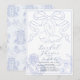 Esta elegante invitación a la ducha de novia incluye una pareja de cisne con un arco/cinta y flores/flores de color azul. En el reverso, un fondo azul cielo claro con motivos franceses de tela de jouy en azul. Personalízalo para tus necesidades. Puedes encontrar productos coincidentes en mi tienda.