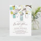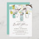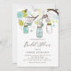 Invite a los huéspedes a su evento con esta invitación a la ducha de personalizable. Cuenta con fantásticas jarras de albañil azules y verdes, cuerdas del corazón y flores. Personalice esta invitación a una ducha de novia con jarra de albañil añadiendo sus detalles. Esta ducha de novia personalizado es perfecta para duchas de primavera e invierno. Está disponible en otros colores y cartón.