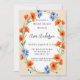 Una delicada pintura acuática con un naranja vibrante y flores silvestres azules suaves. La disposición floral muestra intrincadas pinceladas, mezclando tonos cálidos y fríos para una composición armoniosa inspirada en la naturaleza. Perfecto para los amantes del arte botánico y los Bodas.