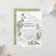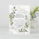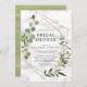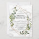 Moderna, elegante y de moda, esta invitación a la ducha de matrimonio presenta un diseño de imitación geométrica de cobre adornado con vegetación eucaliptos de color agua, sobre una textura de mármol blanco. Personalizado en elegante tipografía suave y negra. La parte posterior de la tarjeta presenta una textura de color verde oliva. Copyright Elegant Invita. Todos Los Derechos Reservados.