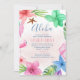Moderna playa del océano aloha Estilo hawaiano modelo de invitación a fiesta de ducha de novia con flores de hibisco coloridas con hojas tropicales, una estrella de mar, un pájaro flamingo rosa sobre un fondo rosa de color agua de color rosa rubor. ++++++++++ La invitación es apta para el verano aloha, la costa, el océano, la playa, el destino estacional por las fiestas de novias de boda marino.