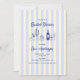 Celebra las próximas nupcias de tu futura novia favorita con nuestras invitaciones mediterráneas para una ducha de novias. Esta invitación presenta un ilustracion de comida y vino hecho a mano en un estilo divertido y lúdico acompañado de un tipo de letra informal, manuscrita, que captura perfectamente la emoción y la alegría de la ocasión. La invitación da un tono sereno y alegre a la ocasión, con una suave y acogedora paleta de colores de crema de mantequilla y tiras azules suaves. Este entorno tranquilo se complementa perfectamente con el texto azul oscuro, creando una mezcla armoniosa de colores.