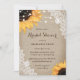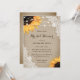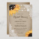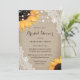 Rústica invitación a una ducha de novias floridas con girasoles en un fondo de burún y encaje.