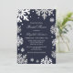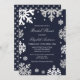 Invitación a la ducha de novia con fondo azul marino con copos de nieve gris y blanco plateado