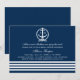 El diseño de la invitación a la ducha de boda náutico moderno y precoz incluye un monograma boda que se muestra dentro de un ancla de un bote con acentos de nudos y rayas de cuerda. Color azul marino, gris claro / plata y blanco.
