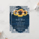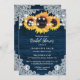 Hermosa invitación a la ducha de novia con girasoles azul marino rústico sobre un fondo de madera de granero adornado con encajes florales blancos y luces de cuerda. Elementos coincidentes disponibles.
