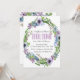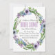 Una encantadora invitación a la ducha de matrimonio incluye flores y plumas de color agua en tonos pastel y morados con hojas verdes sobre un fondo blanco. El fondo muestra una sección de la corona por encima. Elementos de coordinación disponibles en la colección de plumas y flores.