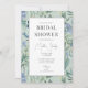 La elegante invitación a la ducha de novia cuenta con fondo de menta con hortensias azules, flores amarillas y vegetación.
