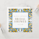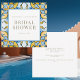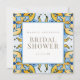 Invitación a ducha de novia azul y amarilla. Cuadrada. Texto dorado. Mediterráneo.
