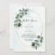 Estas modernas invitaciones a la ducha de novias presentan un diseño de color acuático con hojas de eucalipto y marcos geométricos de color oro falso. Personalízalos con tu propio texto. Productos de correspondencia disponibles